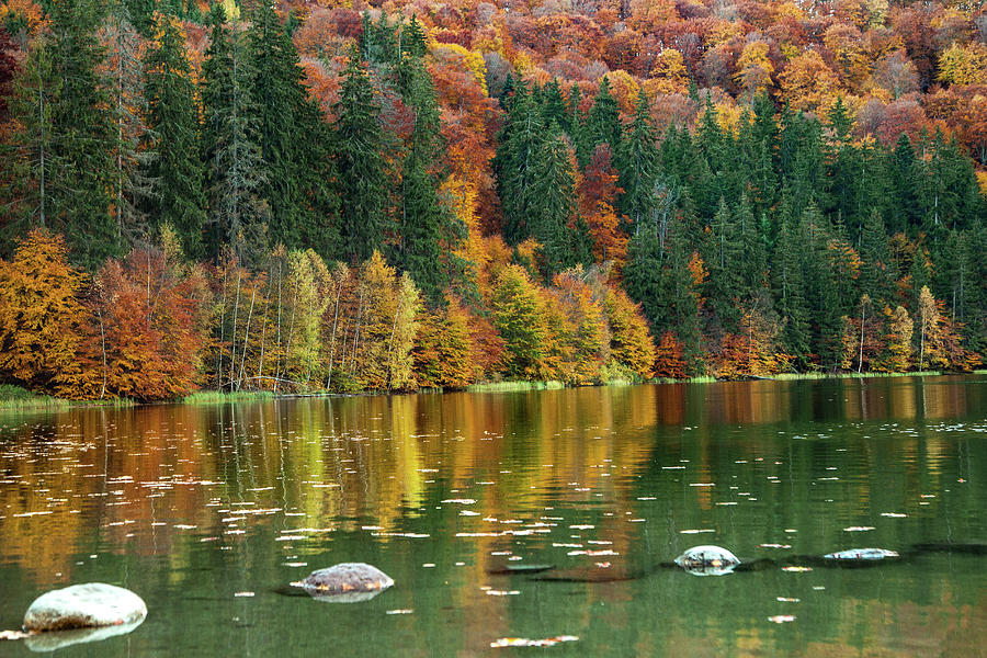 Autumn Colorful Foliage With Lake Reflection Many Colored Trees Reflecting In Water In Autumn
